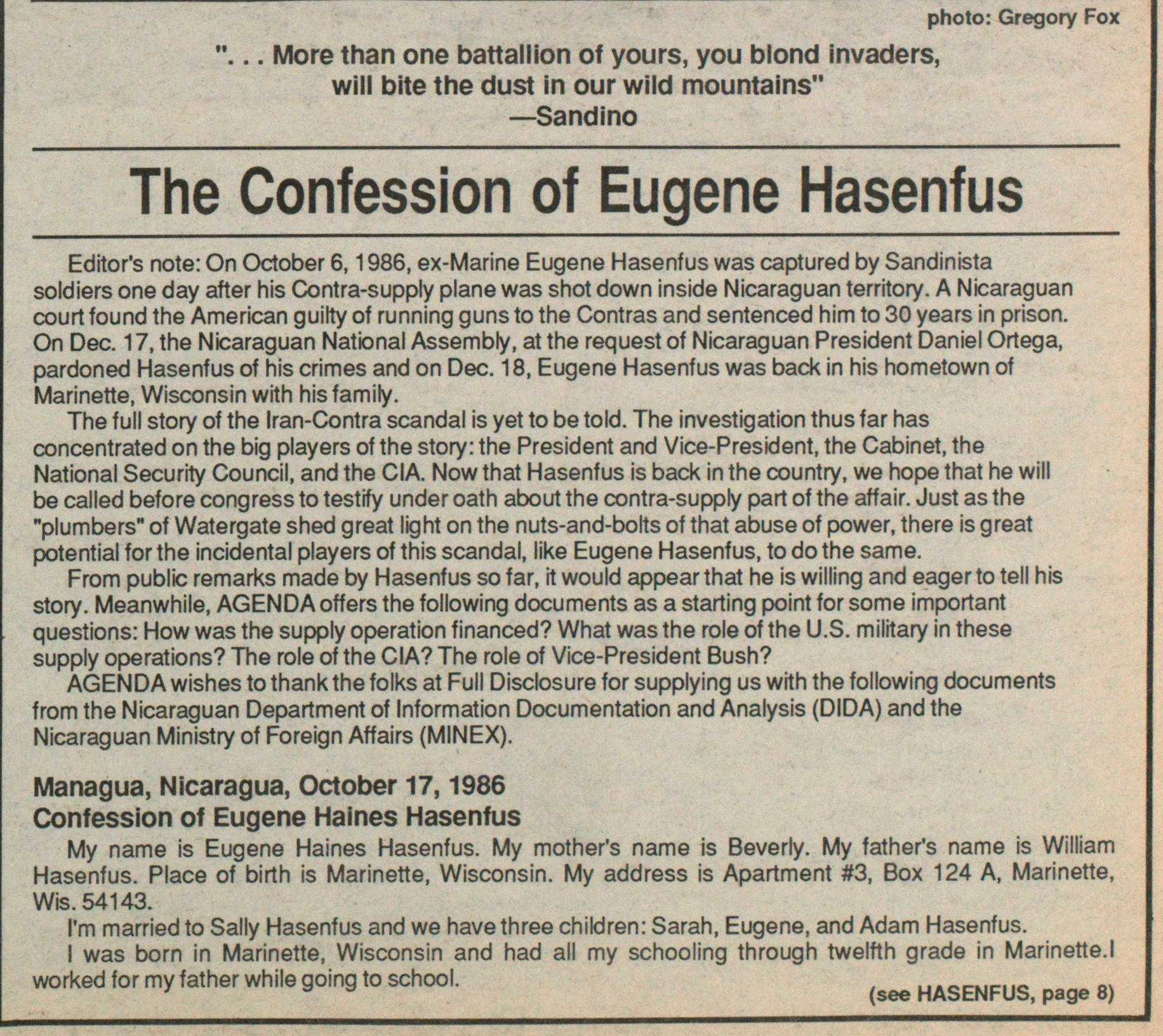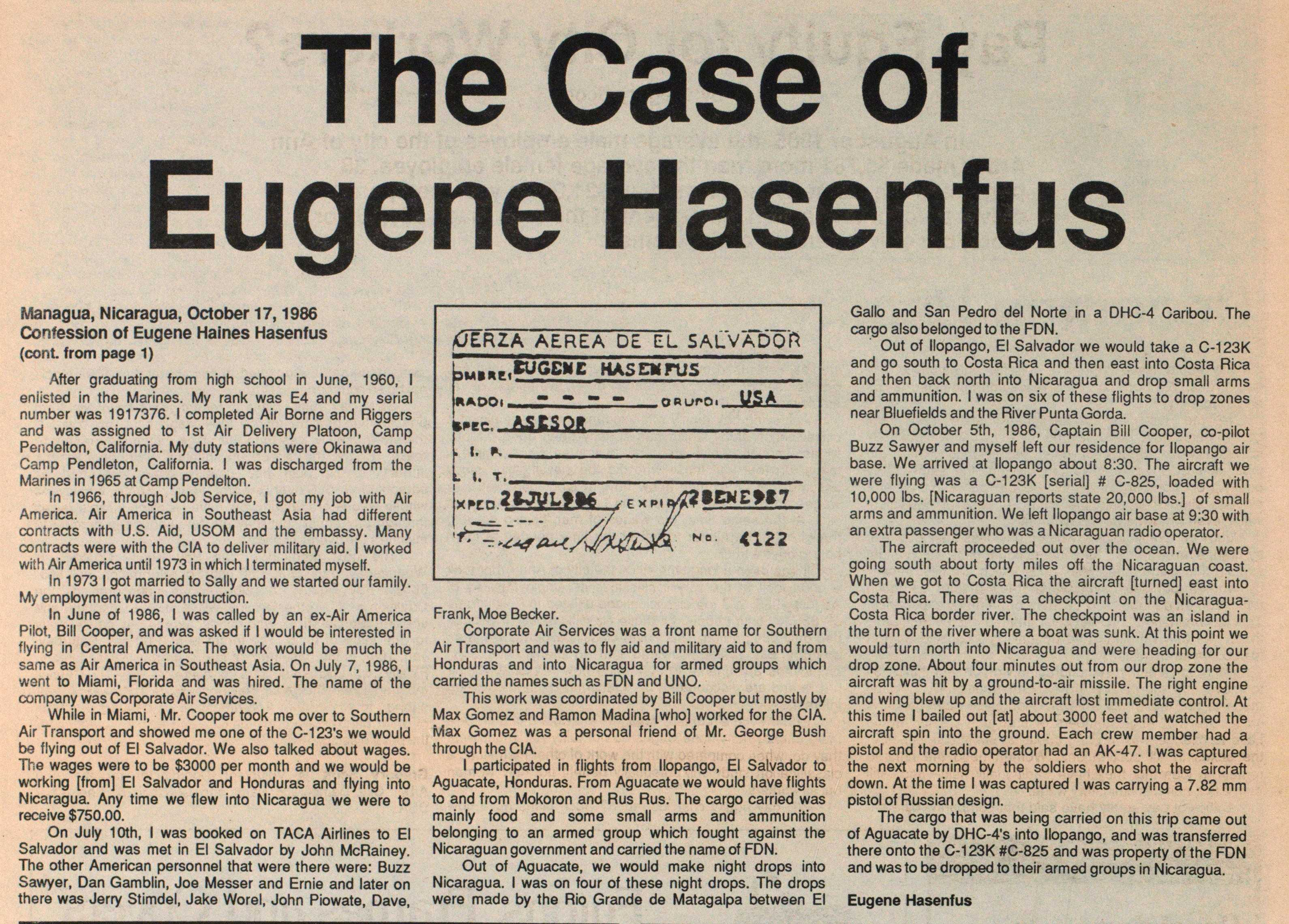 My name is Eugene Haines Hasenfus. My mother's name is Beverly. My father's name is William Hasenfus. Place of birth is Marinette, Wisconsin. My address is Apartment #3, Box 124 A, Marinette, Wis. 54143.